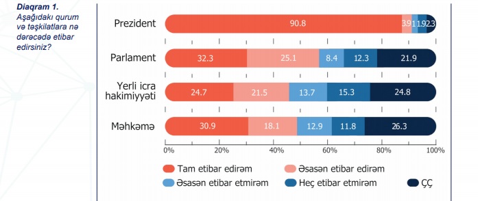 Sosial Tədqiqatlar Mərkəzinin də keçirdiyi "İnam indeksi” jurnalının ictimai rəy sorğusuna əsaslanan analitik hesabatında prezidentin reytinqini ictimai rəydə ölçərkən əldə etdiyi nəticələr yerli icra qurumları ilə bağlı vəziyyətin nə qədər qorxunc olduğunu üzə çıxartdı. "Respondentlərin 57.4%-i parlamentə, 46.2%-i yerli icra hakimiyyətinə, 49%-i məhkəməyə etibar edir.