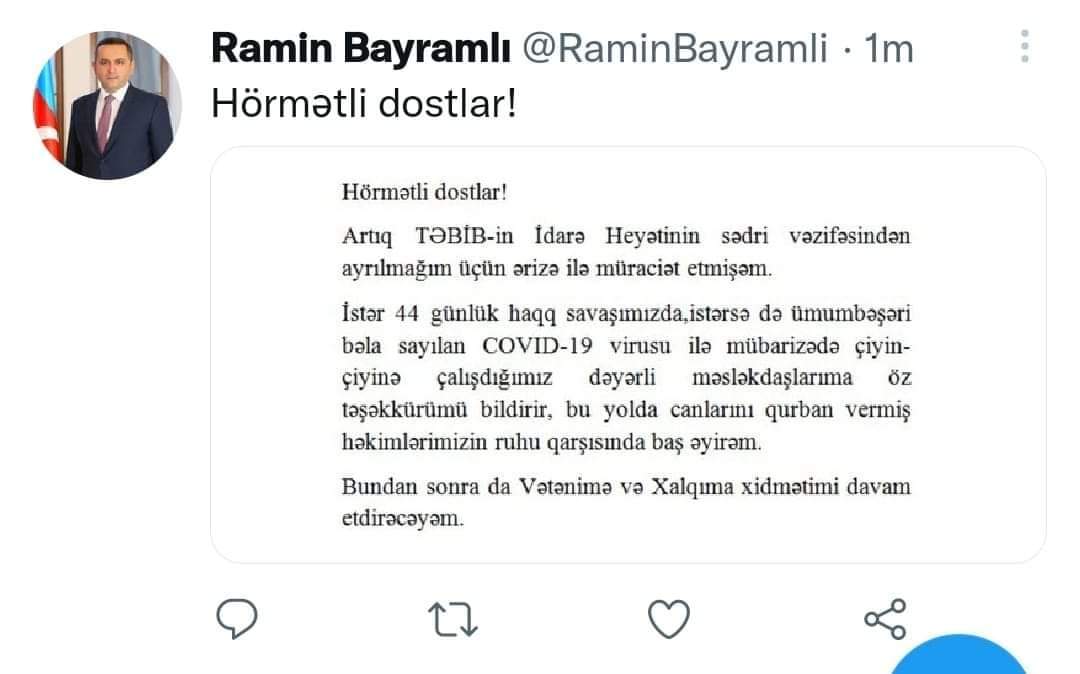 "Artıq TƏBİB-in İdarə Heyətinin sədri vəzifəsindən ayrılmağım üçün ərizə ilə müraciət etmişəm.