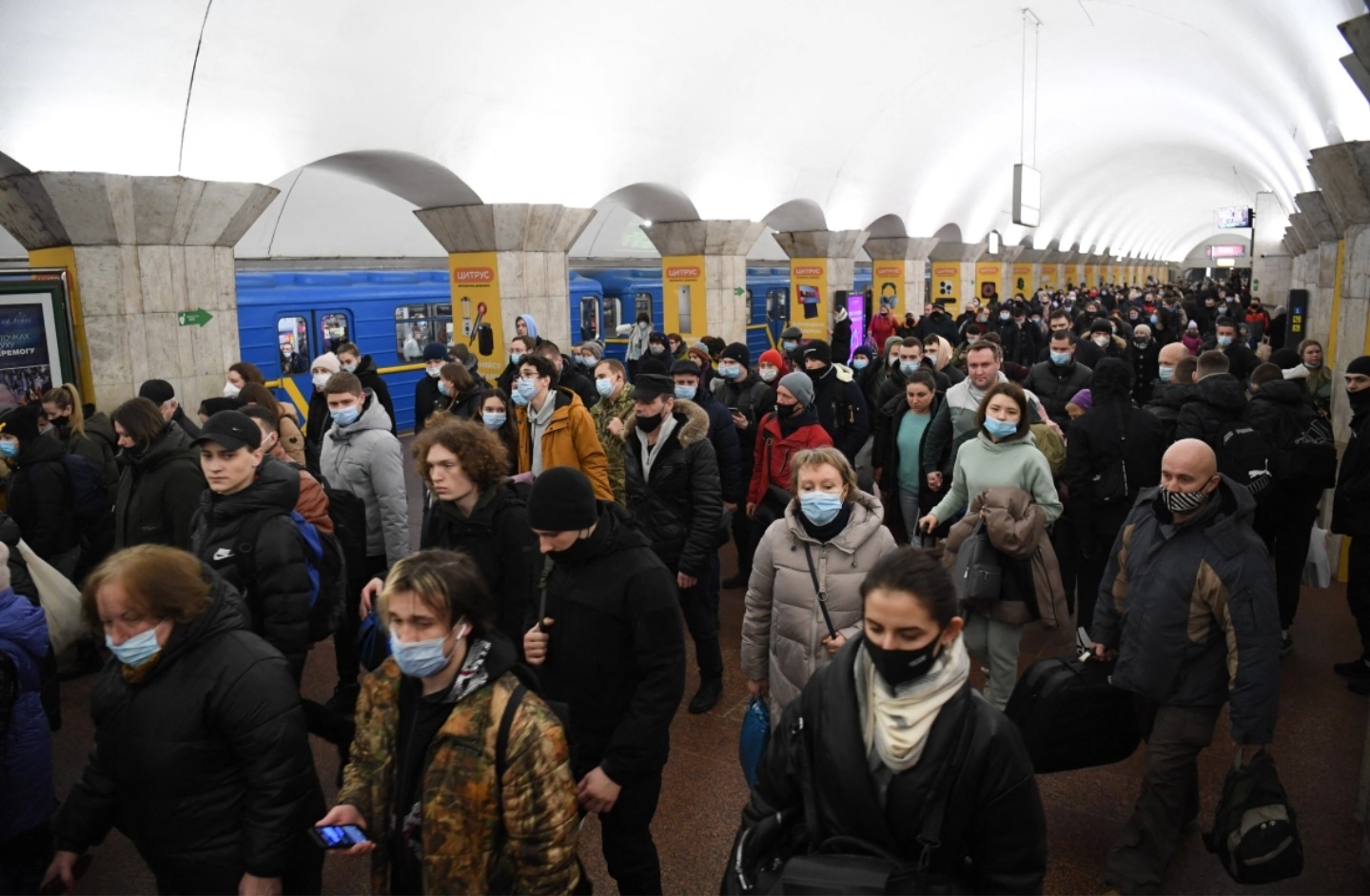 Bəziləri çanta və çamadan daşıyan insanlar Kiyev metrosunda gəzirlər. (Daniel Leal/AFP)