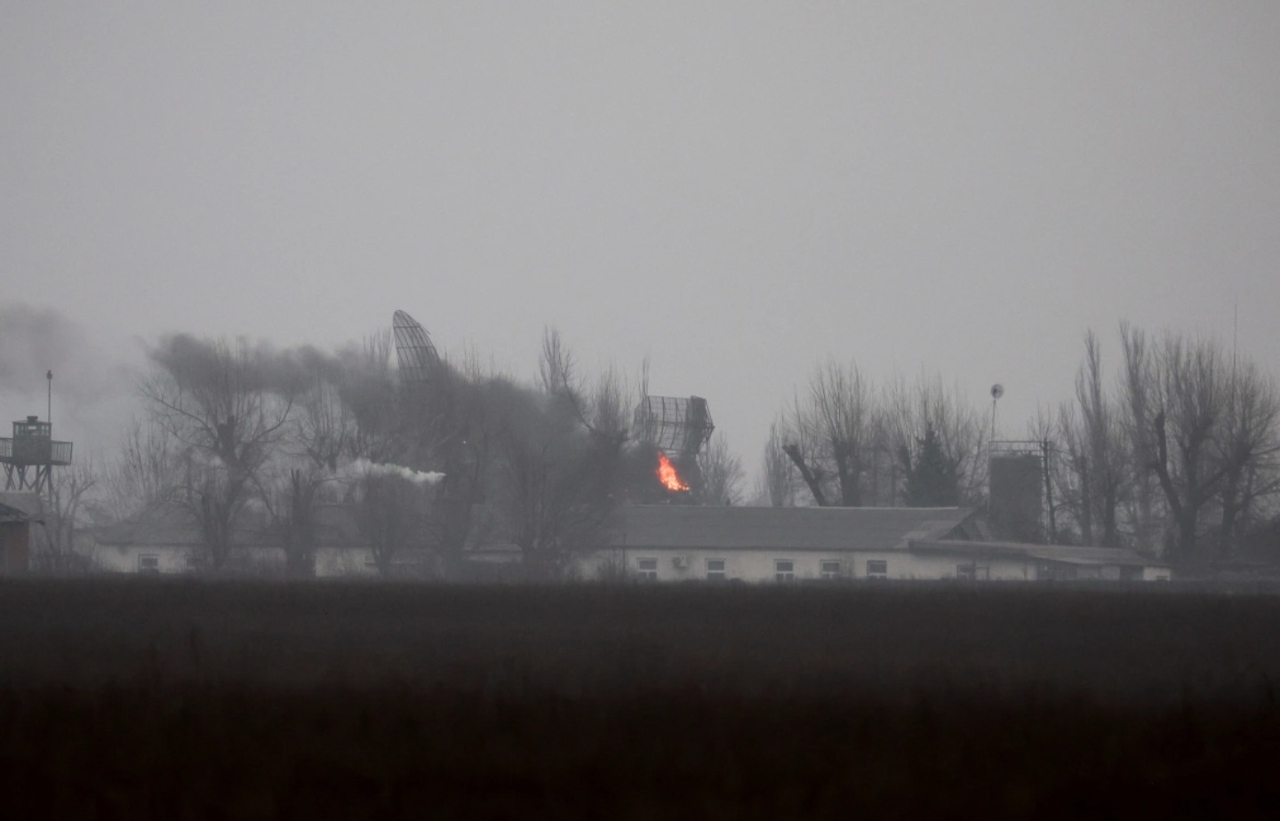 Mariupol hava limanı yaxınlığındakı hərbi obyektdən yanğının çıxdığı görünür. (Karlos Barria/Reuters)