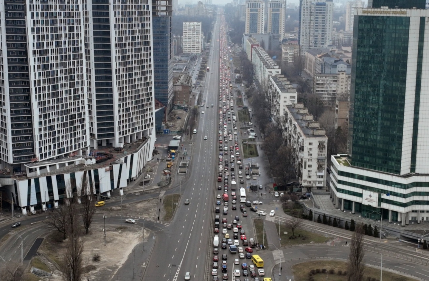 İnsanlar Kiyev şəhərini tərk edərkən tıxaclar müşahidə olunur. (Emilio Morenatti/AP Fotosu)