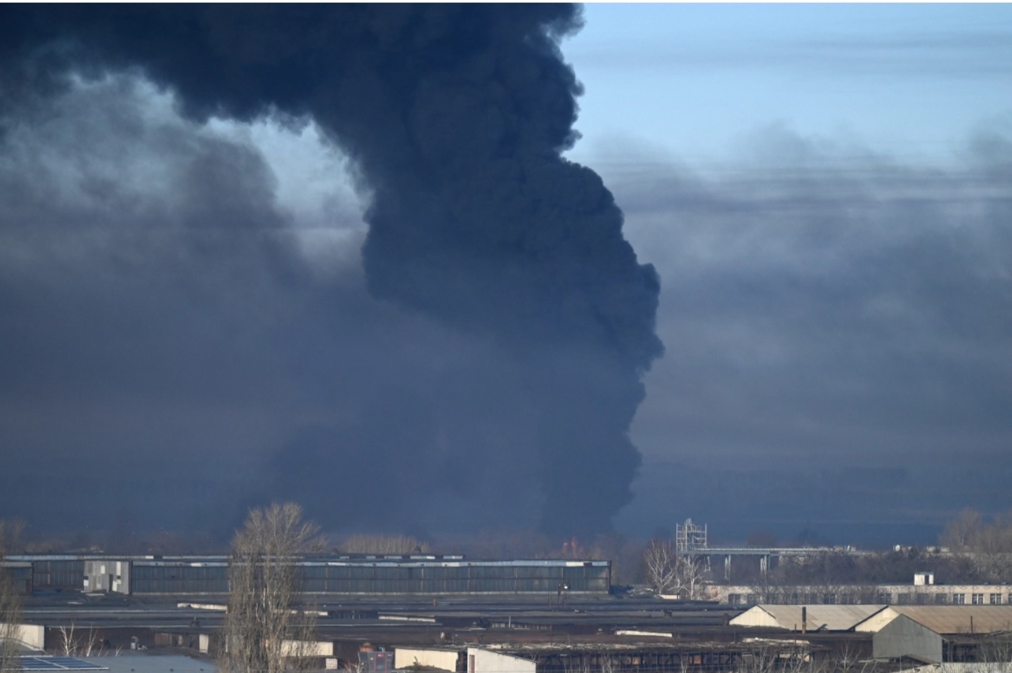 Xarkov yaxınlığındakı Çuquyev hərbi hava limanından qara tüstü qalxıb. (Aris Messinis/AFP)