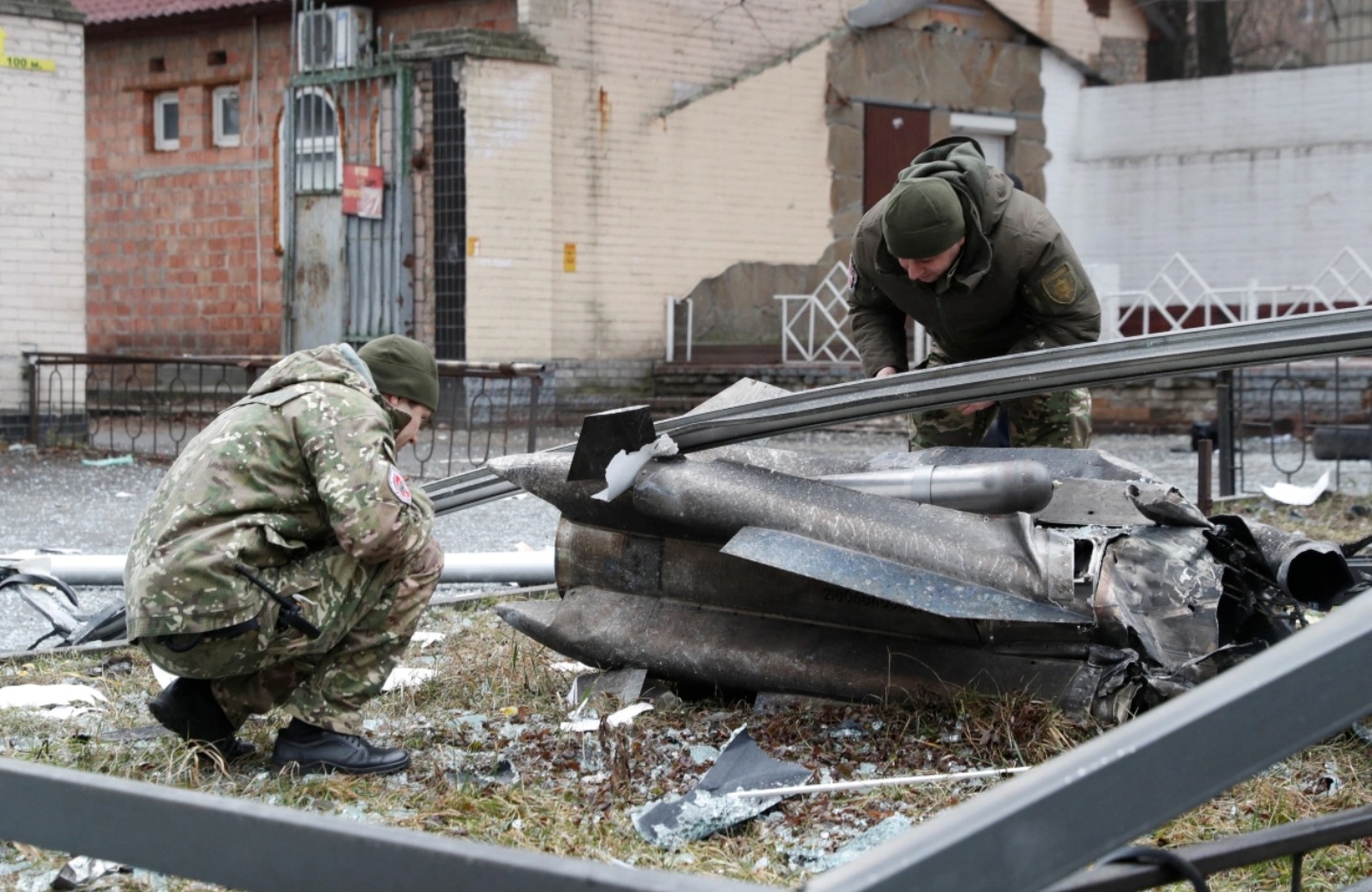 Polis əməkdaşları Kiyevdə küçəyə düşən raketin qalıqlarını yoxlayır. (Valentin Ogirenko/Reuters)