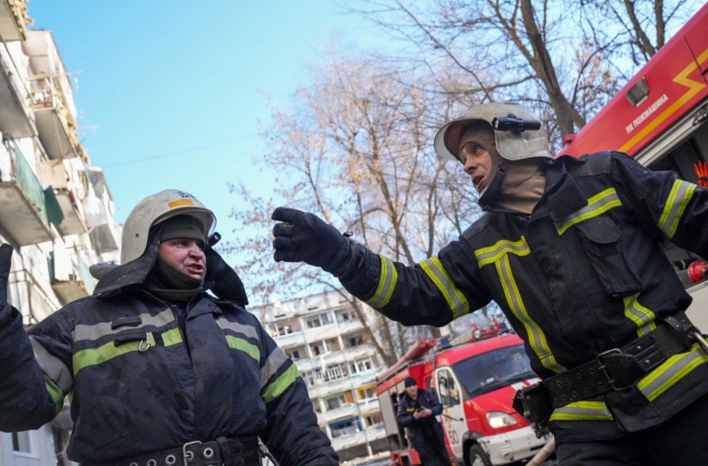 Ukrayna yanğınsöndürənləri Çuhuivdəki yaşayış kompleksinə hava hücumundan sonra gəliblər. (Volfqanq Şvan/Anadolu Agentliyi)