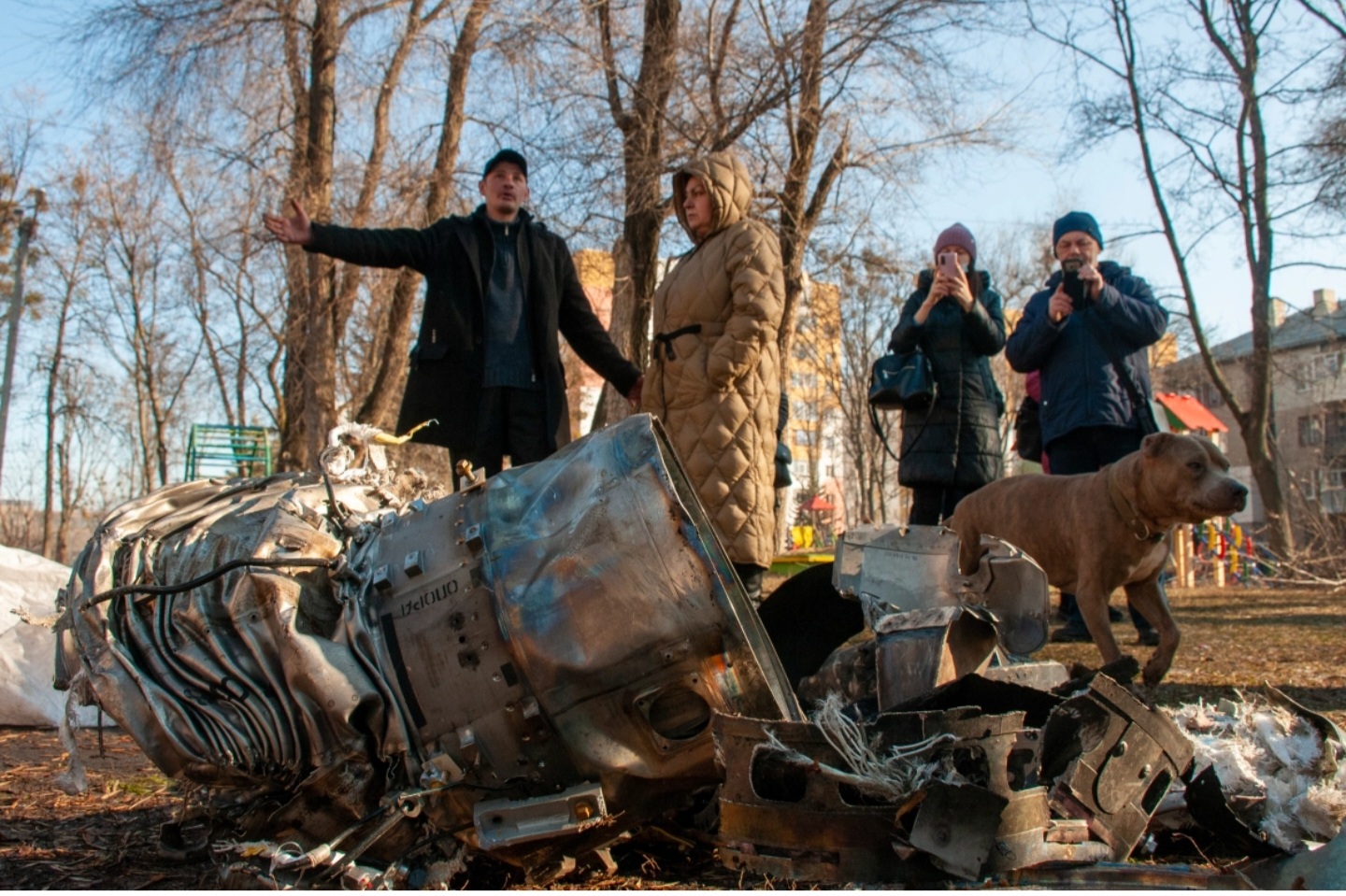 Xarkovda insanlar küçədə hərbi texnikanın qırıqlarının yanında dayanıblar. (Andrew Marienko/AP Fotosu)