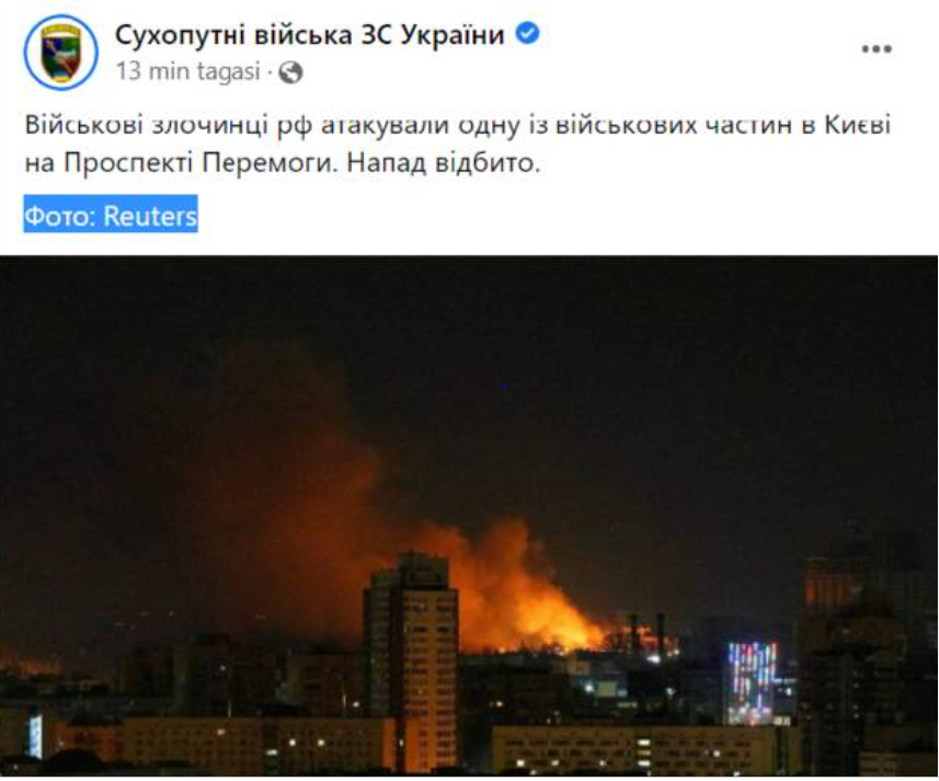Rusiya hərbçiləri fevralın 26-da səhər tezdən Kiyevdəki hərbi hissələrdən birinə hücum edib, bu barədə Ukrayna Silahlı Qüvvələrinin Quru Qoşunlarının Facebook səhifəsind məlumat verilir.