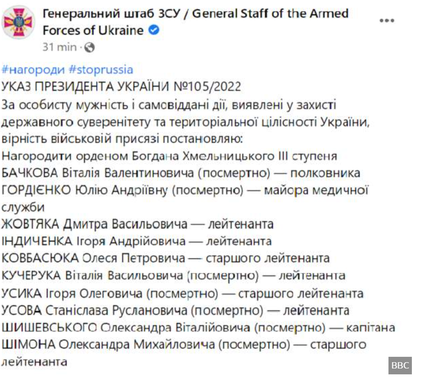Ukrayna prezidenti Vladimir Zelenski bir qrup hərbiçini ölümündən sonr təltif edib. Bu barədə Ukrayna Baş qərargahı məlumat yayıb.