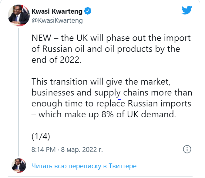 "Böyük Britaniya Rusiya nefti və neft məhsullarının idxalını 2022-ci ilin sonuna dayandıracaq. Bu keçid bazara və müəssisələrə Rusiya neftinə alternativlər tapmağa imkan verəcək. Hazırda Britaniya bazarına daxil olan neft və neft məhsullarının ın 8%-i Rusiyanın payına düşür", nazir Tvitter hesabnda deyib.