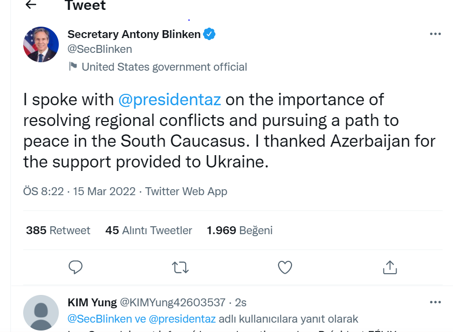 ABŞ dövlət katibi Antoni Blinken Azərbaycan Prezidenti İlham Əliyevlə telefonla danışdığını və Ukraynanı dəstəklədiyi üçün ona təşəkkür edib. O, bu barədə öz Tvitter hesabında yazıb .