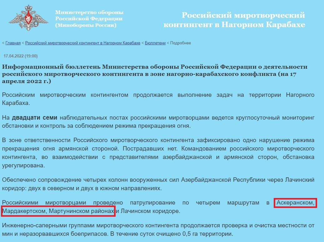 Rusiya MN-nin saytında yayımlanan bülletendə Azərbaycan rayonlarının adı təhrif olunmuş formada göstərilib. Belə ki, Xocavənd, Ağdərə və Əsgəran inzibati ərazi vahidləri erməni dilində müvafiq olaraq, "Martuni”, "Mardakert” və "Əsgəran” kimi qeyd edilib.