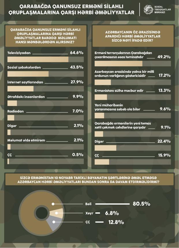 Keçirilən rəy sorğusunun nəticələrinə əsasən, respondentlər Ermənistanın 10 noyabr tarixli birgə bəyanatın şərtlərinə əməl etməməsi halında, Azərbaycanın hərbi əməliyyatları bundan sonra da davam etdirməsini dəstəklədiklərini ifadə ediblər. Belə ki, rəyi öyrənilənlərin mütləq əksəriyyəti - 80,5%-i Azərbaycanın hərbi əməliyyatları bundan sonra da davam etdirməli olduğunu düşünür. Hərbi əməliyyatları erməni terrorçularının Qarabağdan çıxarılmasının əsas təminatı olaraq görən respondentlərin 84,1%-i bu əməliyyatların davam etdirilməsini dəstəkləyib.