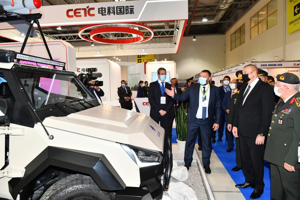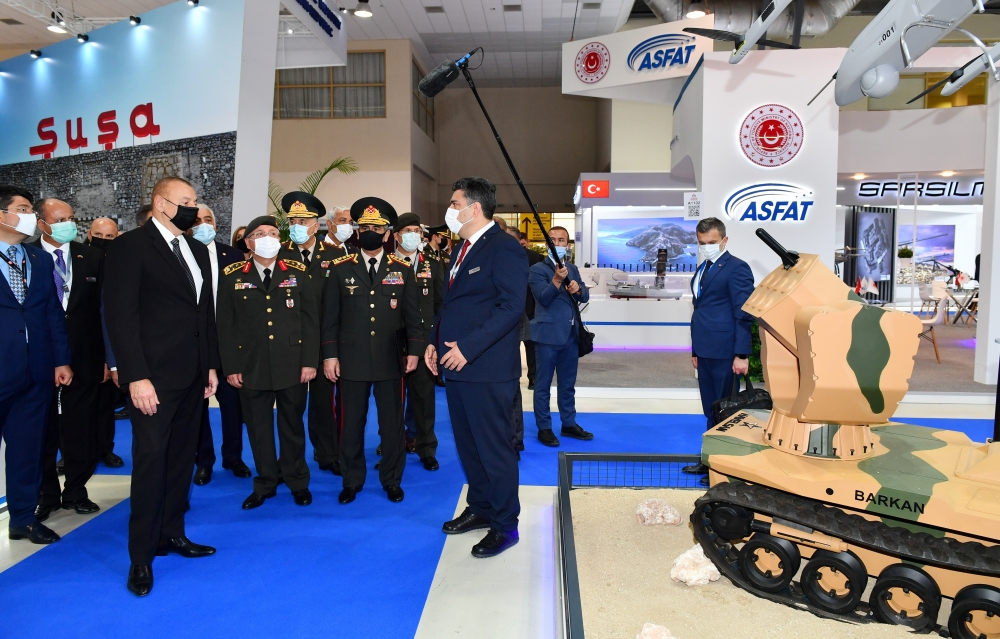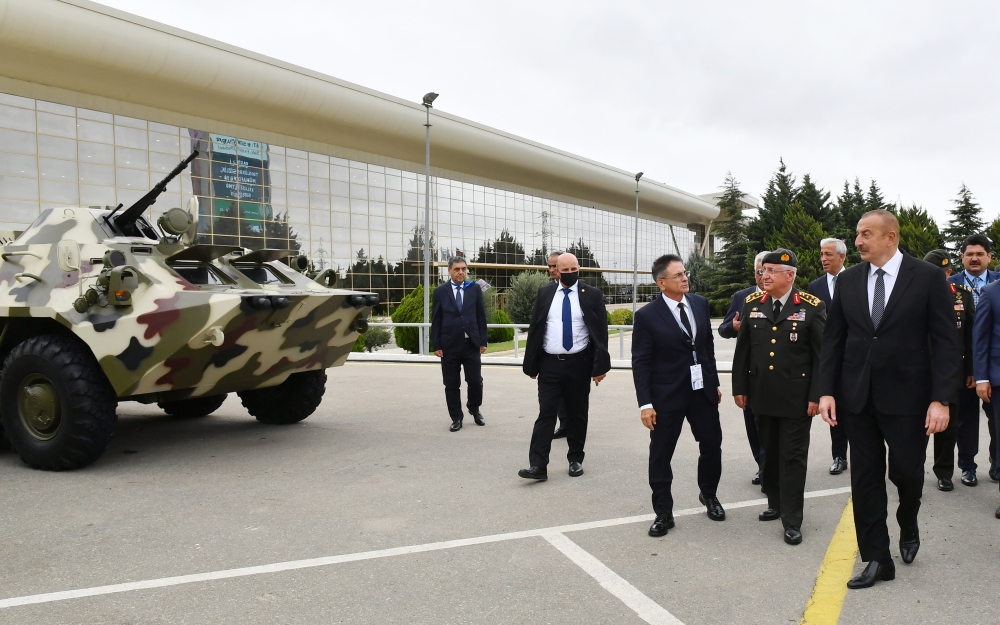 Prezident İlham Əliyev Azərbaycan Müdafiə Sənayesi Nazirliyinin pavilyonunda nümayiş etdirilən hərbi məmulatlara baxıb. Milli Təhlükəsizlik Qüvvələrinin ehtiyaclarını ödəmək üçün müdafiə təyinatlı məmulatların, döyüş sursatlarının, zirehli hərbi texnikanın və digər vasitələrin yaradılması, istehsalı, təkmilləşdirilməsi, təmiri, utilizasiyası, idxalı/ixracına və xarici bazarlarda satışına cavabdeh olan nazirliyin pavilyonlarında son illərdə ölkəmizdə istehsal olunan yüngül və ağır hərbi texnikalar nümayişə çıxarılıb. Döyüş kəşfiyyat texnikası, çoxməqsədli, kəşfiyyat və zərbə pilotsuz uçuş aparatları, müxtəlif çaplı atıcı silahlar, mühəndislik texnikaları və digər hərbi texnikalar sərginin maraq doğuran eksponatları sırasındadır.