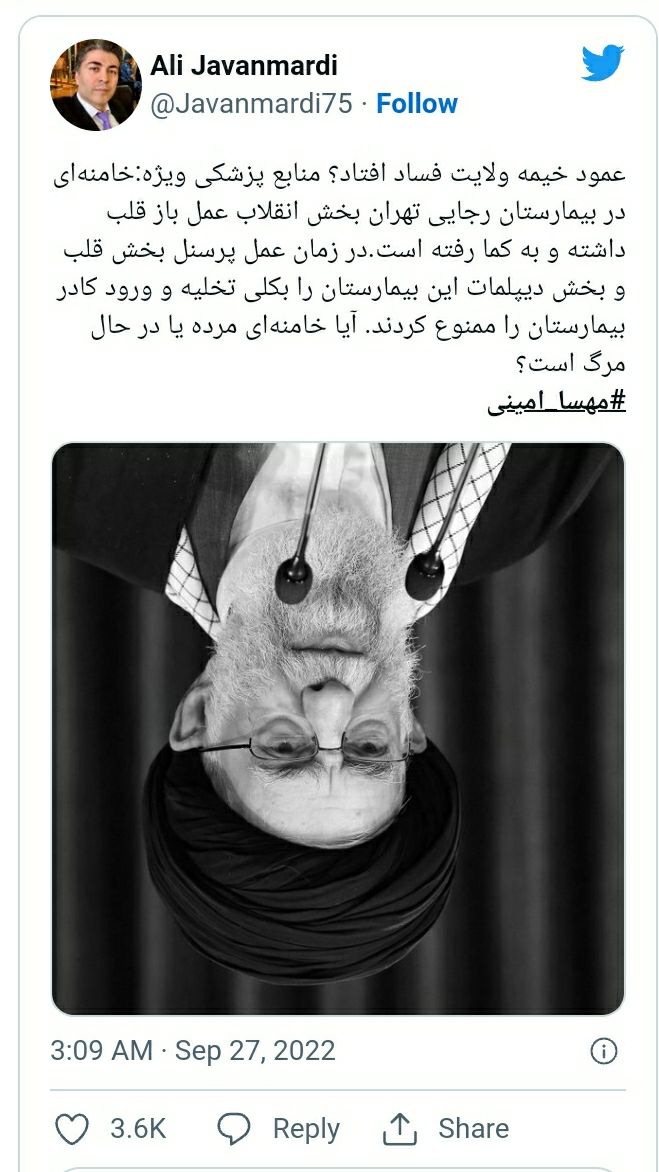 İranlı müstəqil jurnalist Əli Cavanmərdi İranın ali rəhbəri Əli Xameneyinin səhhətinin ağırlaşdığı barədə məlumat verib. Bu barədə jurnalist öz tvitter hesabında yazıb.