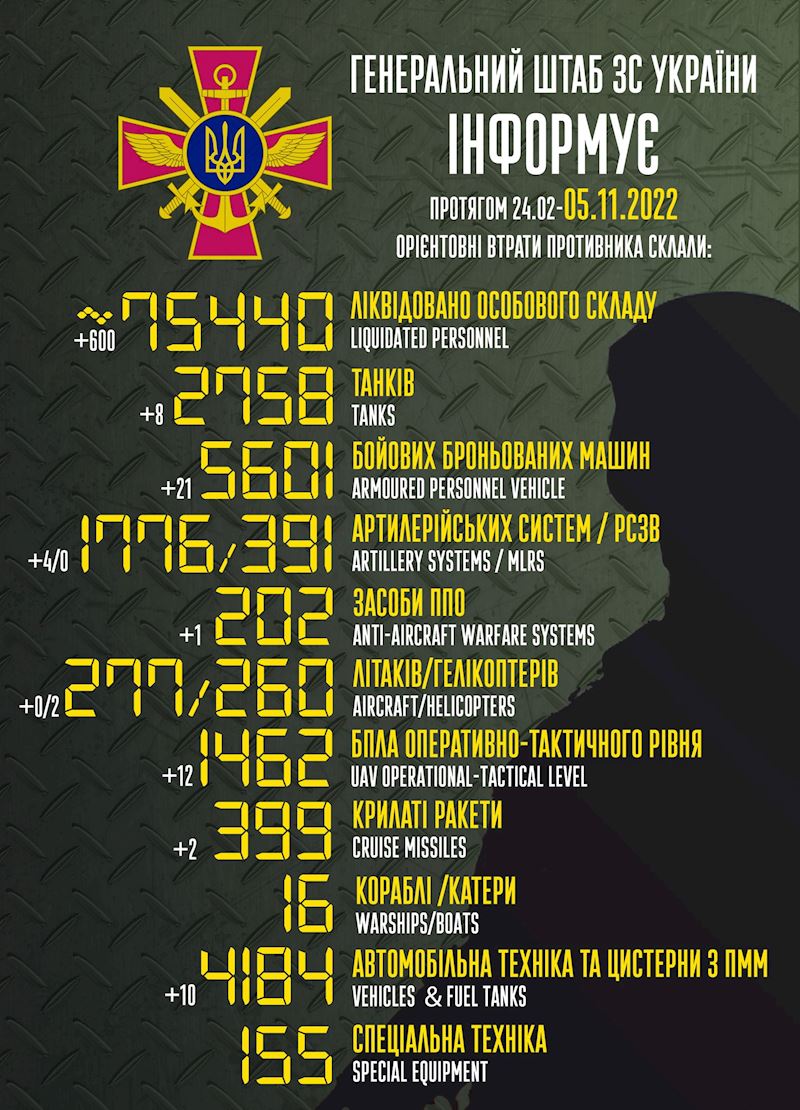 Ukraynada hərbi əməliyyatlar başlayandan indiyədək Rusiya Silahlı Qüvvələrinin 75 440 hərbçisi məhv edilib.