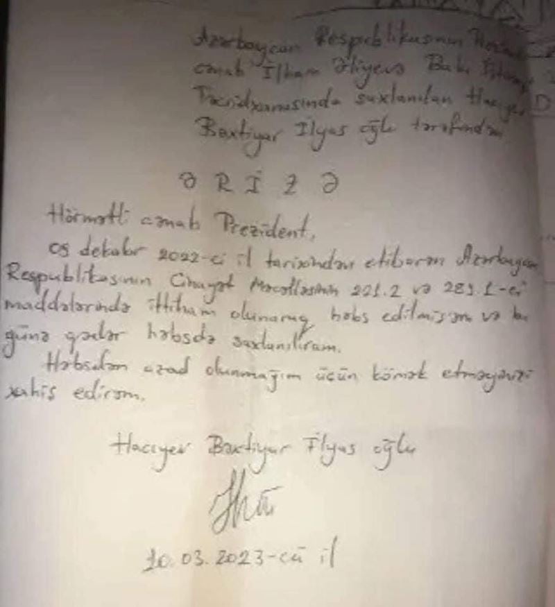 Daha əvvəl sosial şəbələrdə Hacıyevin Prezidentə müraciətini əks etdirən ərizənin fotosu yayılıb.