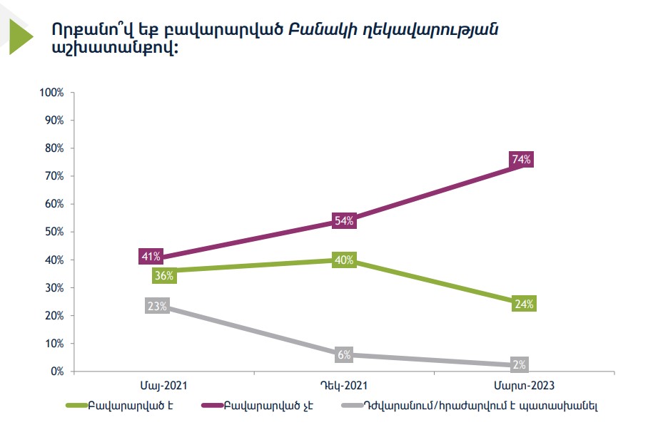 Amerika Beynəlxalq Respublikaçılar İnstitutunun (İRİ) keçirdiyi sosioloji sorğunun nəticələrinə görə respondetlərin 74%-i ölkədəki ordunun fəaliyyətindən narazıdır. Bu barədə Ermənistan mətbuatı yazıb.