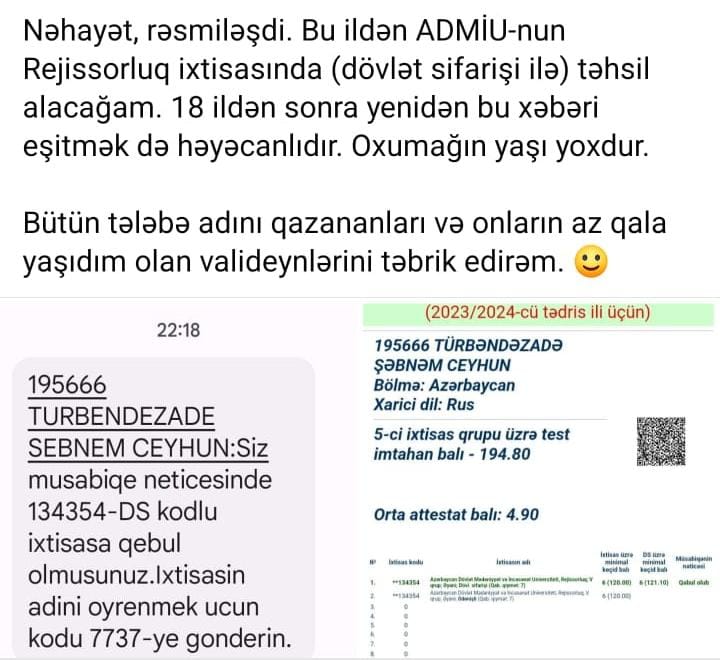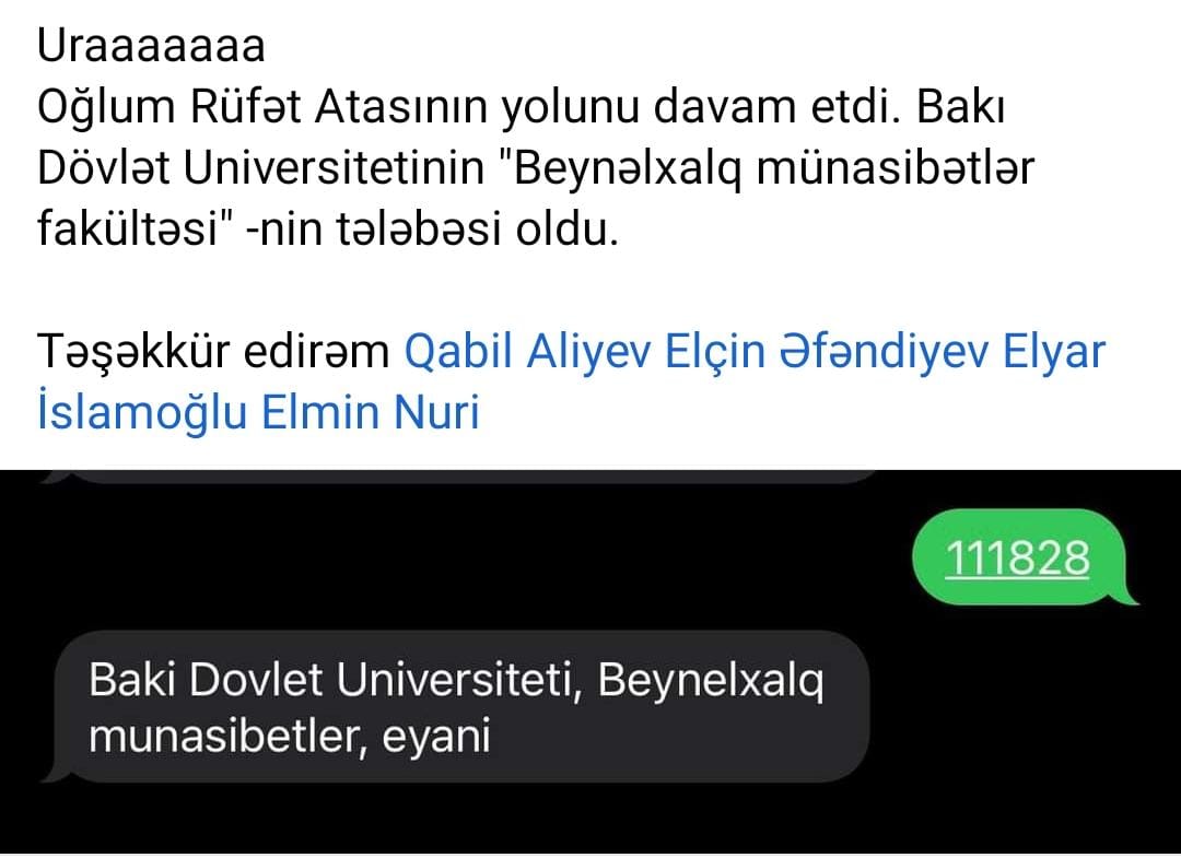 Jurnalist Vəfa Aslanın oğlu isə Azərbaycan Tibb Universitetinə (ATU) qəbul olub.