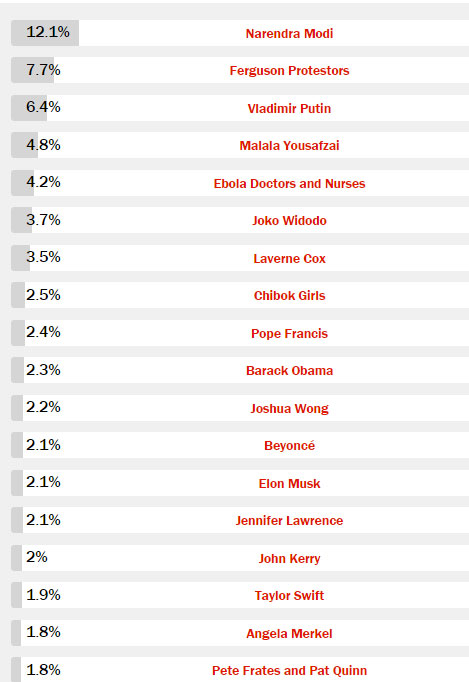 Amerikanın məşhur "Time" jurnalı "İlin adamı"nı seçir.ANN.Az dünya mətbuatına istinadən xəbər verir ki, siyahıda yer alan bu ilki namizədlərin adları açıqlanıb. Siyasət, incəsənət, idman və biznes aləmindən bir çox şəxsin olduğu siyahı üçün səs vermə müddəti 6 dekabr gecə saat 23:59-da sona çatacaq. 2014-ci "İlin adamı" 10 dekabrda açıqlanacaq. Hər il keçirilən sorğuda səslərlə yanaşı jurnal redaktorlarının seçimi də mühümdür.Siyahıda Türkiyə prezidenti Rəcəb Tayyib Ərdoğan, Hindistan Baş naziri Narendra Modi, Barak Obama, Vladimir Putin, Almaniya kansleri Angela Merkel, İran prezidenti Ruhani və İŞİD lideri Bağdadi də var."Time"ın hazırladığı "İlin adamı" siyahısında yer alan 50 şəxs: