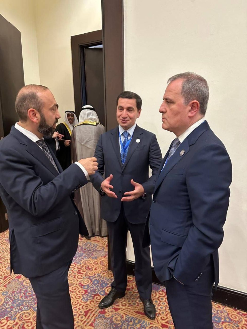 В социальных сетях опубликованы фотографии министра иностранных дел Азербайджана Джейхуна Байрамова, помощника президента Азербайджана Хикмета Гаджиева и министра иностранных дел Армении Арарата Мирзояна, оживлённо беседующих на полях саммита.