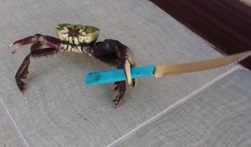Ранее в сети приобрел известность другой краб с ножем, а также катающийся на санках кот.